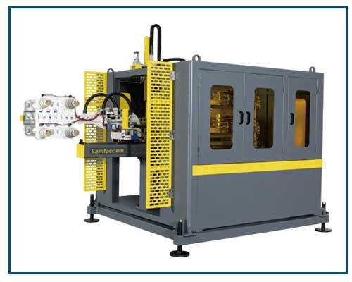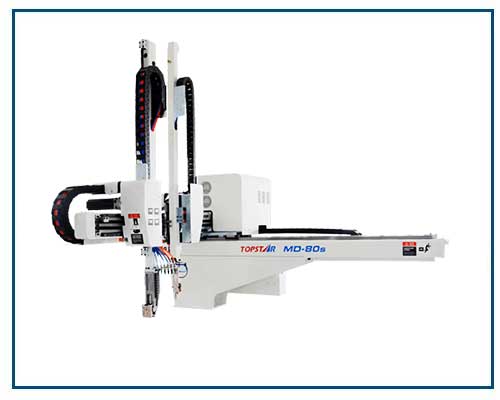 Applicable for small machines. 80T IMM pneumatically operated. Servo operated sprue picker for better accuracy